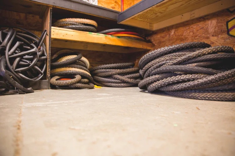 ABOVE: A pile of spare tires freshly stripped off of old bikes.