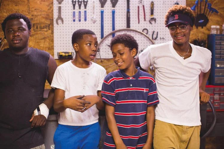ABOVE: Jquare Smith, 16, Justin Carter, 13, Tremain Gary, 11, and Jadin Lewis, 15, hang out at the shop on Saturdays.
