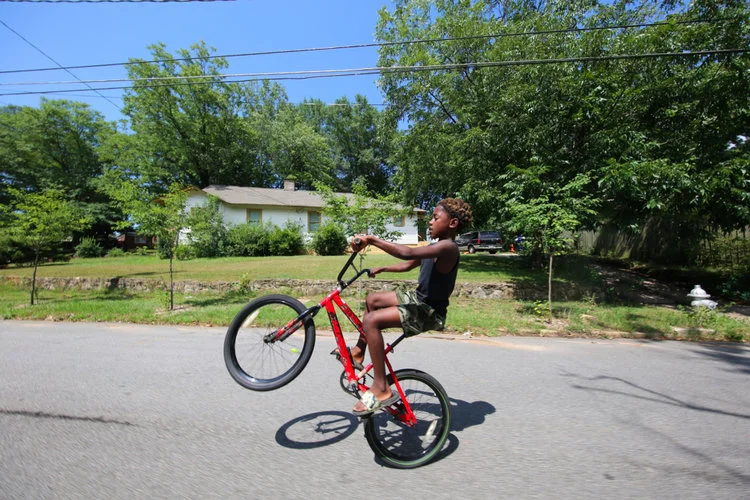 ABOVE: Derrick McLemore, 10, practices “walking” his bike.