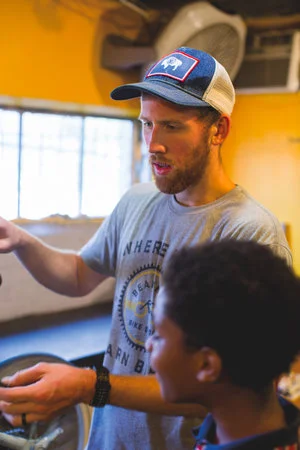 EARNING A BIKE || Now there’s a point system at the shop that keeps everything running. Ten points earns you your first bike and a lock. You earn one point for each hour worked at the shop rehabbing donated bikes. The more hours kids rack up, the more perks they earn. As they achieve different levels, they earn new privileges, such as working with more sophisticated tools. They can trick out their bikes with upgrades and they get a different color shirt, almost like a martial arts belt, every time they advance. They can earn other bikes for siblings or friends too.